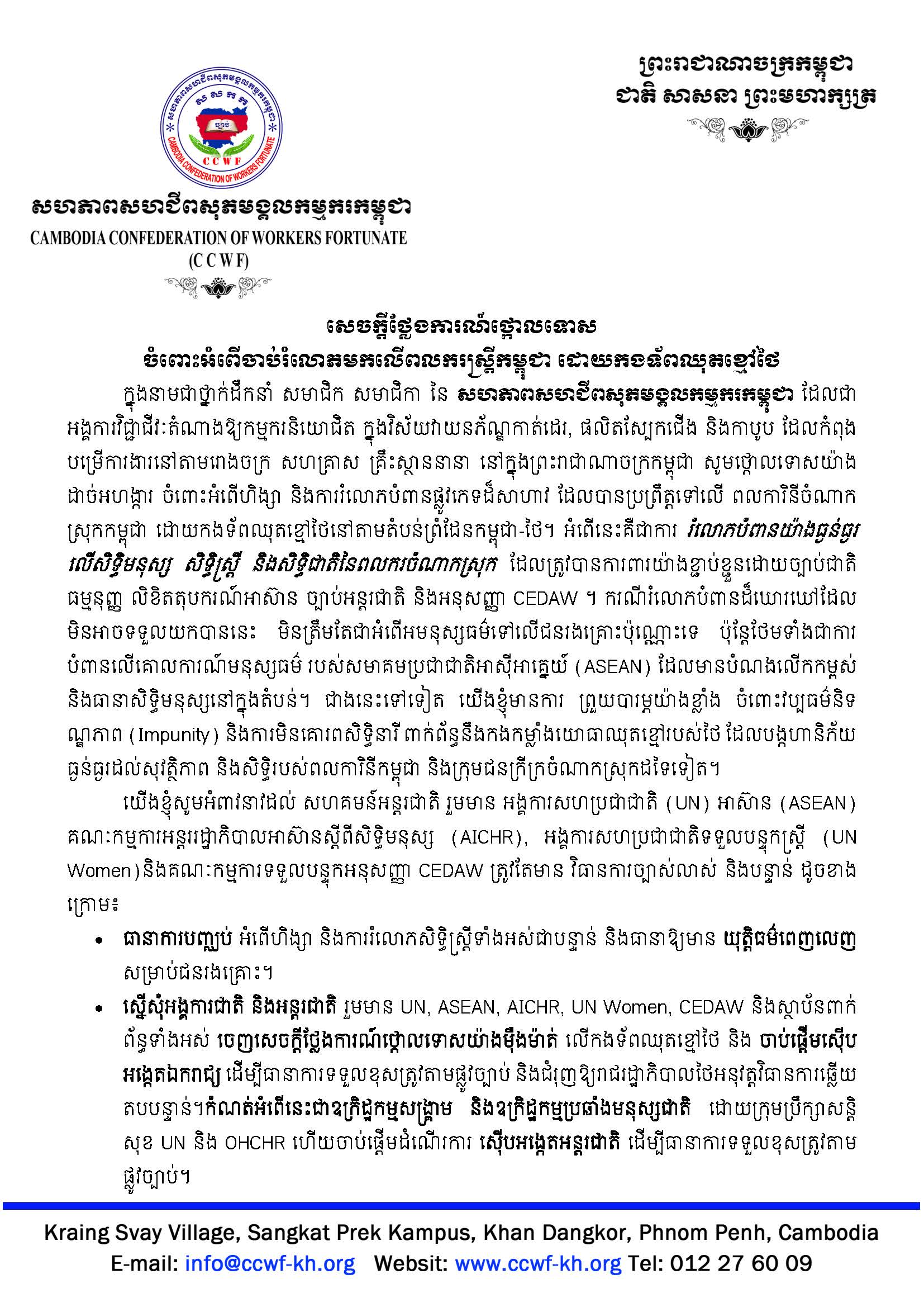 ក្នុងនាមជាថ្នាក់ដឹកនាំ សមាជិក សមាជិកា នៃ សហភាពសហជីពសុភមង្គលកម្មករកម្ពុជា ដែលជាអង្គការវិជ្ជាជីវៈតំណាងឱ្យកម្មករនិយោជិត ក្នុងវិស័យវាយនភ័ណ្ឌកាត់ដេរ, ផលិតស្បែកជើង និងកាបូប ដែលកំពុងបម្រើការងារនៅតាមរោងចក្រ សហគ្រាស គ្រឹះស្ថាននានា នៅក្នុងព្រះរាជាណាចក្រកម្ពុជា សូមថ្កោលទោសយ៉ាងដាច់អហង្ការ ចំពោះអំពើហិង្សា និងការរំលោភបំពានផ្លូវភេទដ៏សាហាវ ដែលបានប្រព្រឹត្តទៅលើ ពលការិនីចំណាកស្រុកកម្ពុជា ដោយកងទ័ពឈុតខ្មៅថៃនៅតាមតំបន់ព្រំដែនកម្ពុជា-ថៃ។ អំពើនេះគឺជាការ រំលោភបំពានយ៉ាងធ្ងន់ធ្ងរ លើសិទ្ធិមនុស្ស សិទ្ធិស្ត្រី និងសិទ្ធិជាតិនៃពលករចំណាកស្រុក ដែលត្រូវបានការពារយ៉ាងខ្ជាប់ខ្ជួនដោយច្បាប់ជាតិ ធម្មនុញ្ញ លិខិតតុបករណ៍អាស៊ាន ច្បាប់អន្តរជាតិ និងអនុសញ្ញា CEDAW ។ ករណីរំលោភបំពានដ៏ឃោរឃៅដែលមិនអាចទទួលយកបាននេះ មិនត្រឹមតែជាអំពើអមនុស្សធម៌ទៅលើជនរងគ្រោះប៉ុណ្ណោះទេ ប៉ុន្តែថែមទាំងជាការ បំពានលើគោលការណ៍មនុស្សធម៌ របស់សមាគមប្រជាជាតិអាស៊ីអាគ្នេយ៍ (ASEAN) ដែលមានបំណងលើកកម្ពស់ និងធានាសិទ្ធិមនុស្សនៅក្នុងតំបន់។ ជាងនេះទៅទៀត យើងខ្ញុំមានការ ព្រួយបារម្ភយ៉ាងខ្លាំង ចំពោះវប្បធម៌និទណ្ឌភាព (Impunity) និងការមិនគោរពសិទ្ធិនារី ពាក់ព័ន្ធនឹងកងកម្លាំងយោធាឈុតខ្មៅរបស់ថៃ ដែលបង្កហានិភ័យធ្ងន់ធ្ងរដល់សុវត្ថិភាព និងសិទ្ធិរបស់ពលការិនីកម្ពុជា និងក្រុមជនក្រីក្រចំណាកស្រុកដទៃទៀត។
