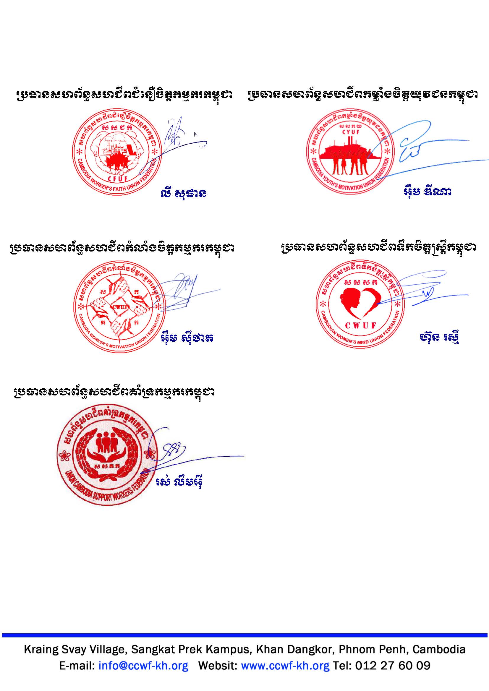 សហភាពសហជីពសុភមង្គលកម្មករកម្ពុជា ព្រមទាំងថ្នាក់ដឹកនាំ សមាជិក សមាជិការទាំងអស់ សូមអំពាវនាវដល់ស្ថាប័នអន្តរជាតិ និងរាជរដ្ឋាភិបាលពាក់ព័ន្ធទាំងអស់ ចាត់វិធានការយ៉ាងរហ័ស និងច្បាស់លាស់ ដើម្បីការពារសិទ្ធិស្ត្រី សិទ្ធិពលករ និងជនរងគ្រោះទាំងអស់៕