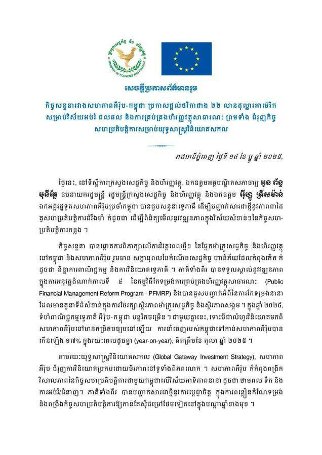 នៅថ្ងៃទី ១៨ ខែ ធ្នូ ឆ្នាំ ២០២៥ ក្រសួងសេដ្ឋកិច្ច និងហិរញ្ញវត្ថុ និង ឯកអគ្គរដ្ឋទូតសហភាពអឺរ៉ុប បានជួបសន្ទនាទ្វេភាគី ដើម្បីបញ្ជាក់សារជាថ្មីនូវភាពជាដៃ គូសហប្រតិបត្តិការដ៏រឹងមាំ ក៏ដូចជា ដើម្បីពិនិត្យមើលនូវវឌ្ឍនភាពក្នុងវិស័យសំខាន់ៗនៃកិច្ចសហ ប្រតិបត្តិការកន្លង ។