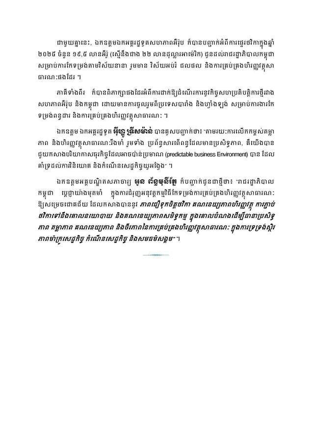 ជាមួយគ្នានេះ, សហភាពអឺរ៉ុប ក៏បានបញ្ជាក់អំពីការផ្ទេរថវិកាក្នុងឆ្នាំ ២០២៥ ចំនួន ១៩,៥ លានអឺរ៉ូ (ស្មើនឹងជាង ២២ លានដុល្លារអាមេរិក) ជូនដល់រាជរដ្ឋាភិបាលកម្ពុជា សម្រាប់ការកែទម្រង់តាមវិស័យនានា រួមមាន វិស័យអប់រំ ផលផល និងការគ្រប់គ្រងហិរញ្ញវត្ថុសា ធារណៈផងដែរ ។
