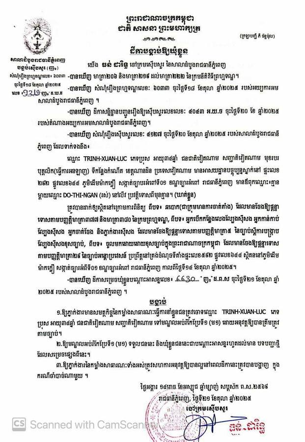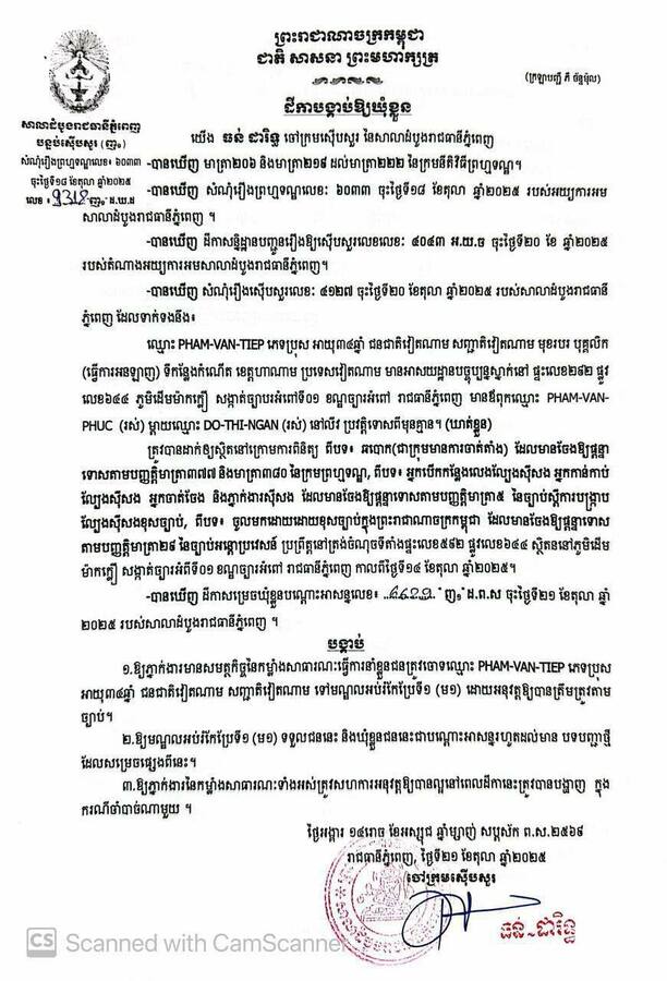 ភ្នំពេញ៖ ដោយផ្អែកលើលទ្ធផលស៊ើបអង្កេតរបស់សមត្ថកិច្ច លោក ធន់ ដារិទ្ធ ចៅក្រមស៊ើបសួរ សាលាដំបូងរាជធានីភ្នំពេញ នៅថ្ងៃទី២១ ខែតុលា ឆ្នាំ២០២៥នេះ បានចេញដីកាចំនួន២ បង្គាប់ឱ្យឃុំខ្លួនបណ្តោះអាសន្ន លើជនជាតិវៀតណាមចំនួន២នាក់ គឺទី១ ឈ្មោះ PHAM VAN TIEP ភេទប្រុស អាយុ៣៤ ឆ្នាំ និងទី២ឈ្មោះ TRINH XUAN LUC ភេទប្រុស អាយុ ៣៤ឆ្នាំ នៅមណ្ឌលអប់រំកែប្រែទី១ “ម១” ដើម្បីបន្តនីតិវិធីរបស់តុលាការ។